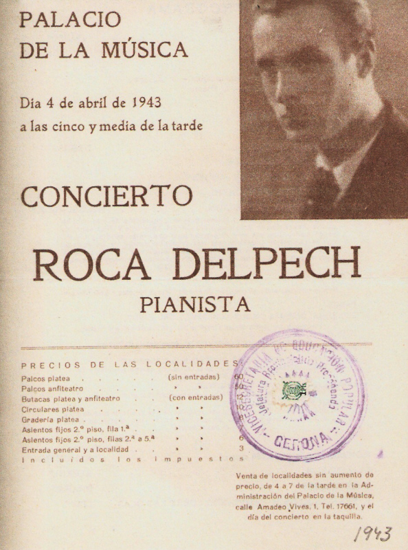 Programa del concert celebrat al Palau de la Música, amb el segell de la Vicesecretaria de Educación Popular de Girona. 4 d'abril de 1943.