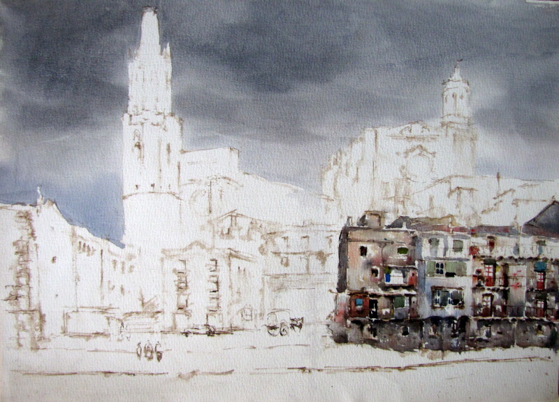 Cases del riu, Girona. Aquarel·la sobre paper. Treball inacabat. |