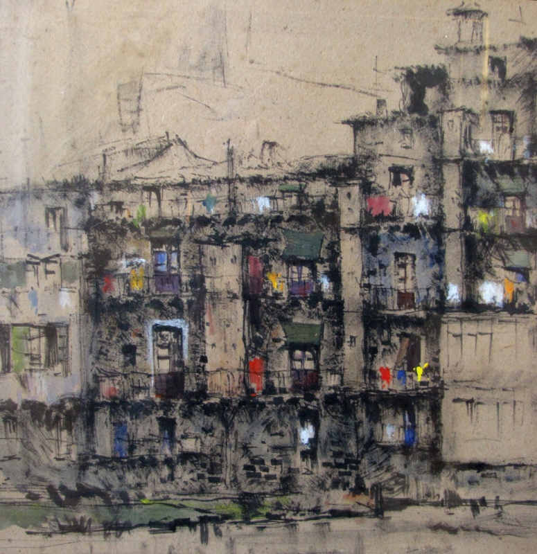Cases del riu, Girona. Ca. 1955-57. 32 x 32 cm. Tinta i guaix sobre cartró [Ampliar] |
