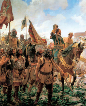 Entrada de Roger de Flor a Constantinoble. Oli de José Moreno Carbonero, 1888. Detall que mostra tropes almogàvers. (Viquipèdia)