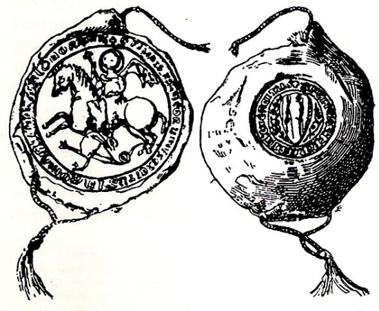 Segell de la Gran Companyia Catalana (1305). En cera verge vermella; anvers: (Sant Jordi) Sigillum felicis exercitus francorum in Romanie parti comorantis. Revers: (Quatre Pals) Sigillum felicis exercitus francorum. (Viquipèdia)