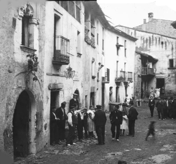(Ampliar) - Grup de gent a la plaça d'Osor. Ca. 1909. Josep Massot i Palmés. Arxiu Fotogràfic Centre Excursionista de Catalunya.