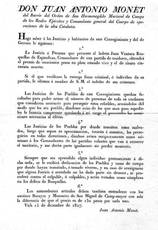 (Ampliar) - Ban de recerca i captura que anuncia la recompensa de 300 pesos de plata per a qui capturi vius o morts el lladre Joan Ventura Rosquellas, i els assassins Bacayra (Becaina) i l'Hostaler de Sant Miquel de Campmajor. 1827. Arxiu Històric de Girona.