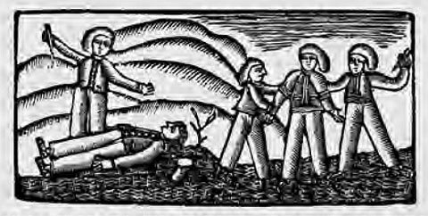 (Ampliar) - L’esquarterament. Dibuix de Martí Garriga. Publicat a "Cançons de bandolers i lladres de camí ral", Josep Gibert:, 1989.