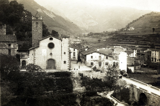 Vista general del poble d'Osor amb l'església de Sant Pere. 1918. Valentí Fargnoli i Annetta. CRDI - Ajuntament de Girona - (Ampliar)