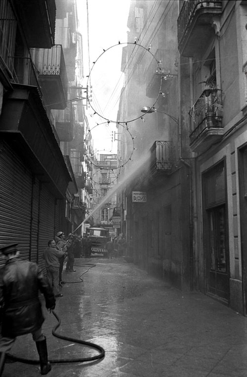 (Ampliar) - Bombers participant en les tasques d'extinció d'un incendi a la Ferreteria Puig, al carrer Abeuradors. 30 de desembre de 1971. Narcís Sans. CRDI - Ajuntament de Girona.