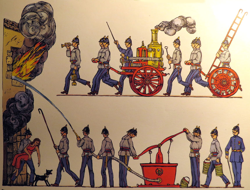 (Ampliar) - Bombers traient aigua d'un soterrani del carrer Argenteria, davant la llibreria Geli, amb una bomba de vapor. 1910. Autor desconegut. CRDI - Ajuntament de Girona. El 2 de setembre del mateix any de 1937, es publicava un ban d'instruccions similar dictades per la Junta de Defensa Passiva de Girona, sobre els senyals d'alarma, en la que, relatiu al cos de bombers i la brigada de Serveis Públics, s'especificava que "En tocar les sirenes d'alarma, hauran de presentar-se immediatament al lloc que se'ls assignarà prèviament tot el personal del Cos de Bombers i Brigada de Serveis Públics. Tindran tot el material a la disposició de la primera crida; els auto-bombes restaran sempre plens d'aigua. Compliran estrictament les ordres que particularment donaran a dit Cos i Brigada l'Alcaldia o Junta de Defensa Passiva." (Font: L'Autonomista, 2 de setembre de 1937). En el mateix sentit, al llarg d'aquest any es publicarien diversos bans.