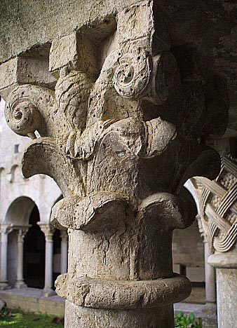 Capitell amb decoració de mescla de fulles d'acant amb pinyes al centre superior de cada costat, i amb cintes perlades amb rínxols.