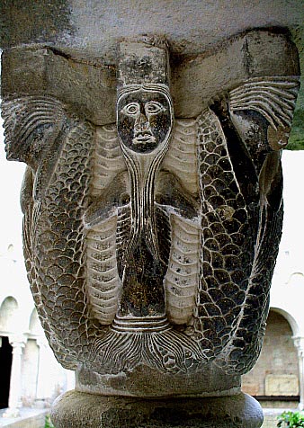 Aquest mateix tema l'hem trobat en el creuer de l'església (capitell T), però presentat d'una manera totalment distinta, molt més discreta. A més, contrasta el caràcter de la sirena de l'interior de l'església amb aquestes del claustre. Aquella escultura és més rústega i més dura. Aquestes sirenes del claustre són d'una labor filigranada.