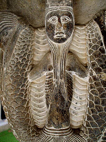 Capitell amb decoració colossal de tipus mitològic, amb quatre sirenes-peix, una a cada cara. Calzada, a l'obra esmentada a la bibliografia, descriu que [...] En aquest cas es tracta d'unes sirenes amb dues cues sostingudes amb les mans molt enlaire, deixant al descobert els genitals. [...] es tracta del Naixement de les sirenes. En el cos de la noia s'hi marquen molt bé les costelles, els pits i unes llargues trenes que li pengen al davant.