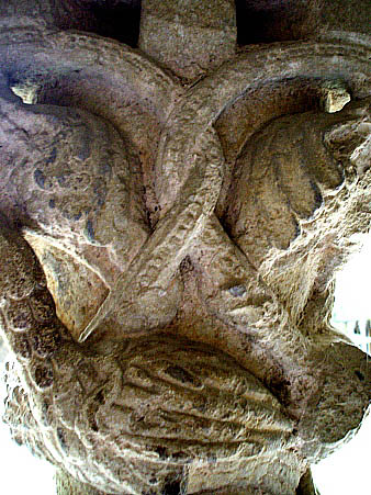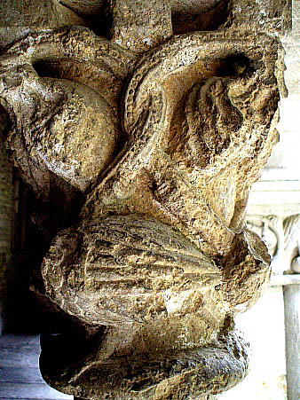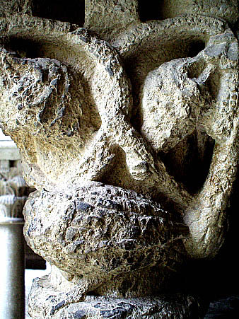 Capitell nº 12Capitell amb decoració d'ocells arrenglerats entre elements vegetals de fulles i tiges, picotejant fruits, seguint una concepció similars a d'altres capitells de la mateixa filera. ![]()