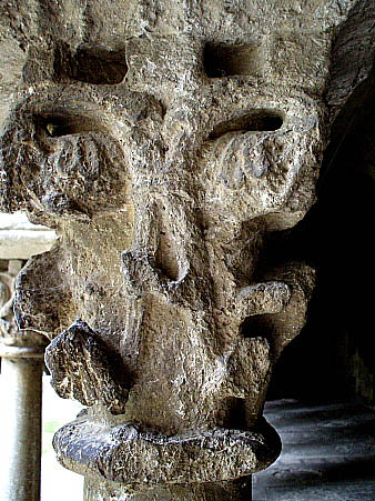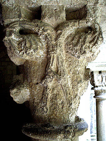 Capitell amb decoració d'elements vegetals, i lluita entre dos personatges armats i amb escuts, molt mutilat.