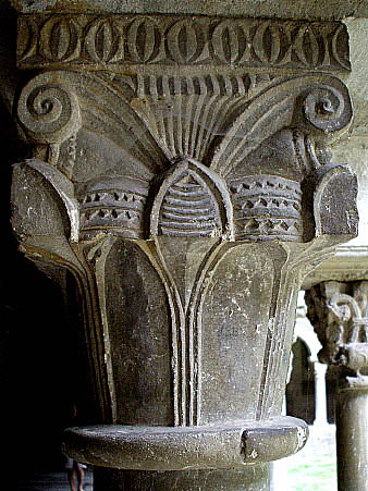 Capitell nº 18Capitell gòtic amb decoració de temàtica vegetal, idèntica i continuada a les quatre cares. Aquest és un dels capitells d'época gòtica instal·lat en substitució de l'anterior, desconegut, original del moment de construcció del claustre. Concepció i factura senzilla, similars a les d'altres exemplars de la galeria septentrional.