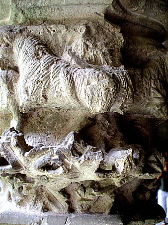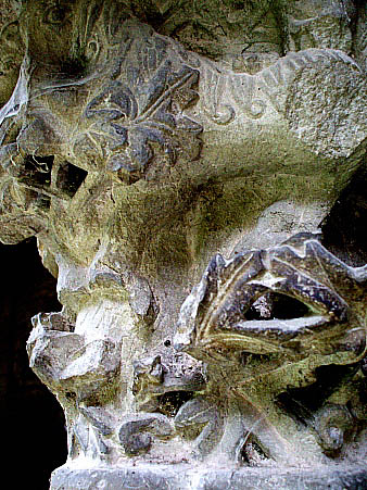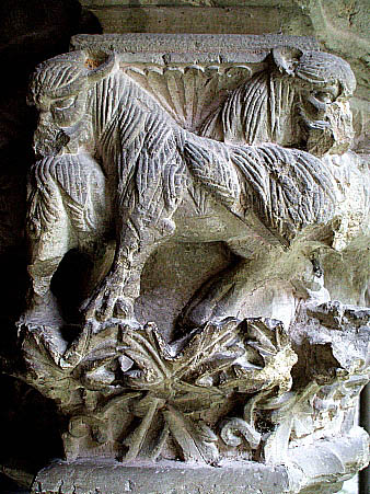 Capitell nº 21Capitell gòtic, del segle XIII, amb decoració de temàtica zoomòrfica amb lleons i vegetal amb fulles i tiges, continuada a les quatre cares, i incorporats els uns dins els altres. Aquest capitell és atribuït al mestre Bartomeu, autor també del capitell nº 58, la imatge de la Mare de Déu del Bell Ull i del sepulcre de Guillem de Montgrí, entre d'altres obres que s'exhibeixen a la catedral de Girona i als seus entorns. També és obra seva un calvari procedent de la porta del cementiri de la catedral (Museu d'Art de Girona). ![]()