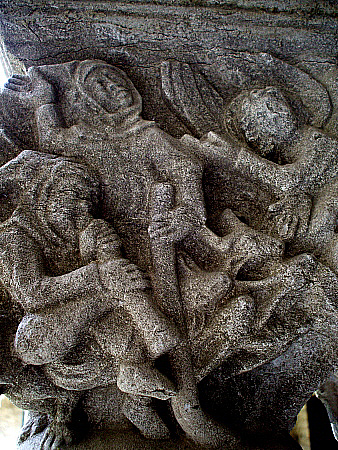 Capitell nº 24Capitell historiat amb escenes de l'anunciació als pastors. ![]() Hi havia a la mateixa contraria uns pastors que vivien al ras i vetllaven de nit guardant el seu ramat. Se'ls aparegué un àngel del Senyor, i la glòria del Senyor els envoltà amb la seva llum, i es van espantar molt. Però l'àngel els digué: «No tingueu por: us anuncio una gran alegria, que ho serà per a tot el poble: avui, a la ciutat de David, us ha nascut un Salvador, que és el Crist Senyor. Això us servirà de senyal: trobareu un infant en bolquers, ajagut en una menjadora». I de sobte s'uní a l'àngel un estol de la milícia celestial que lloava Déu dient: «Glòria a Déu dalt del cel, i a la terra, pau a la humanitat que ell estima». (Lluc, 2:8-14) La temàtica de l'anunciació als pastors d'aquest capitell està relacionada amb la cara 3 del capitell nº 3b, del claustre de Convent de Sant Domènec.