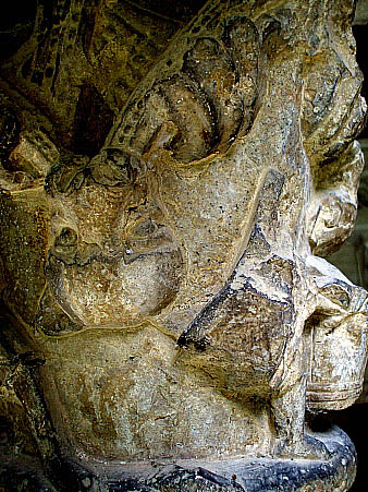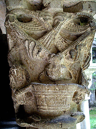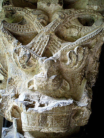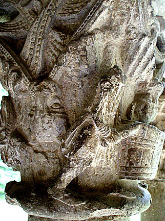 Capitell nº 26Capitell historiat. Cicle de Noè a la vinya. Escenes continuació de les representades al pilar nº 9 anterior. La figuració de les escenes està sobreposada a un fons decorat amb elements vegetals que emergeixen de la boca d'un animal fantàstic, que es perllonguen i encreuen a la part superior del capitell. ![]() Noè, agricultor, fou el primer a plantar una vinya. Va beure vi, es va embriagar i es va despullar dins la seva tenda. Cam, el pare de Canaan, va veure la nuesa del seu pare i ho féu saber als seus dos germans a fora. Però Sem i Jàfet prengueren un mantell, se'l posaren tots dos a les espatlles i, caminant a reculons, van cobrir la nuesa del seu pare. Com que tenien la cara girada enrera, no van veure la nuesa del seu pare. Quan Noè es va despertar de la seva embriaguesa i va saber el que li havia fet el seu fill petit, digué: «Maleït sia Canaan! Que sigui per als seus germans l'esclau dels esclaus!» Digué encara: «Beneït sia Jahvè, el Déu de Sem, i que Canaan sigui el seu esclau! Que Déu dilati Jàfet, que habiti a les tendes de Sem, que Canaan sigui l'esclau d'ells!» (Gènesi, 9:20-27) ![]() La nuesa de Noè, il·lustració de la Crònica de Nuremberg, 1493. (Wikipèdia).