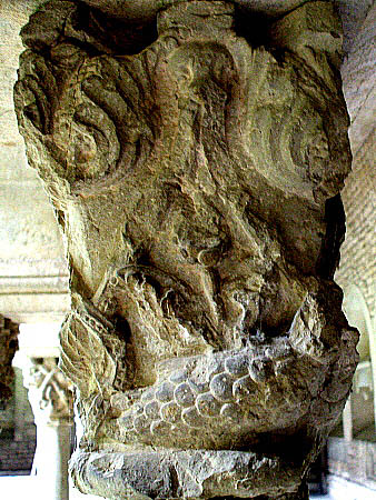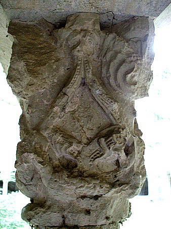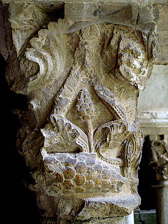 Capitell nº 32Capitell decorat amb elements vegetals que sorgeixen del cap d'un animal fantàstic, amb tres sirenes-peix a la part baixa. La quarta cara no mostrada a les fotografies presenta un alt grau de desgast. ![]()