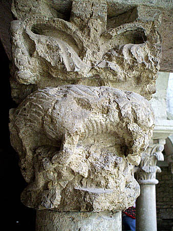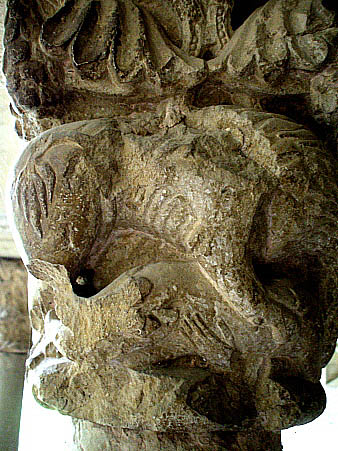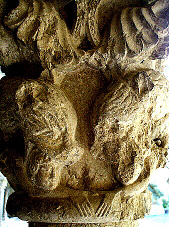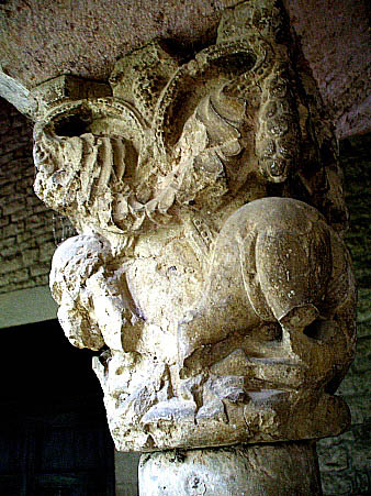 Capitell decorat amb escenes de lleons sobre personatges als que mosseguen el cap.