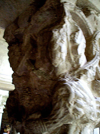 Capitell amb decoració de galls afrontats entre elements vegetals, consistents en fulles i tiges encintades i enroscades.