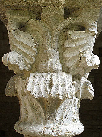 Capitell nº 42Capitell de tipus corinti amb decoració de temàtica vegetal, idèntica i continuada a les quatre cares, que sorgeixen de la boca del cap d'un animal fantàstic, invertit. El disseny i la temàtica són similars a d'altres capitells de la mateixa galeria, amb la variant en aquest cas de la inversió del cap zoomòrfic.