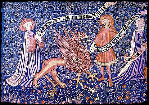 Tapisseria suïssa amb personatges i un griu, (segon quart del segle XV). Kunstgewerbemuseum, Berlin. (Wikipèdia). El griu és un ésser fantàstic present a moltes civilitzacions; des de la minoica, a la grega, la persa, l'escita, i els seu mite, amb algunes variants, s'estén des de les estepes del desert de Gobi a la Mediterrània, transmetent-se a l'època medieval amb tota la seva força.