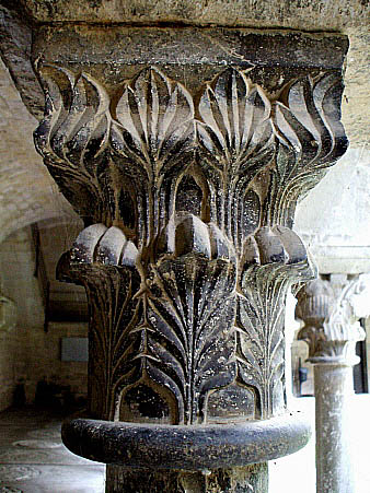 Capitell nº 5Capitell gòtic amb decoració de temàtica vegetal, idèntica i continuada a les quatre cares. Aquest és un dels capitells d'época gòtica instal·lat en substitució de l'anterior, desconegut, original del moment de construcció del claustre. El seu disseny i elaboració són molt similars a l'anterior capitell de la sèrie, el nº 4 i el següent nº 6.