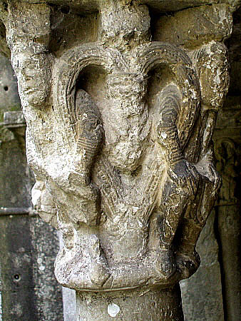 Capitell nº 53Capitell decorat amb quatre figures d'atlants que suporten tiges, que desenvolupen l'element vegetal de la decoració, i que finalitzen a la part central de cada cara en un fruit o pinya.
