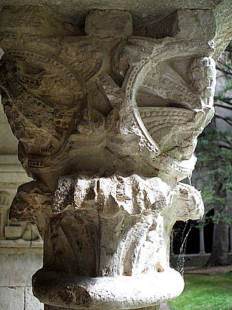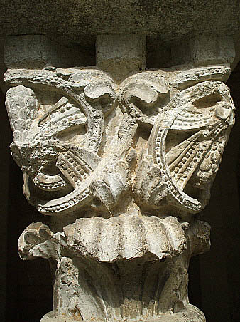 Capitell decorat amb elements vegetals disposats en dos ordres; en un primer, inferior, fulles d'acant, per damunt del qual sorgeixen tiges, fulles i fruits encreuant-se i repetint el disseny a les quatre cares.