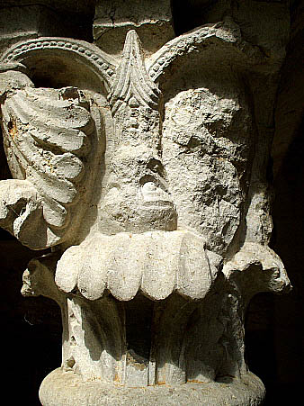 Capitell decorat amb elements vegetals consistents en conjunts de tiges, i fulles que sorgeixen del cap d'un animal fantàstic, invertit, repetint el disseny a cadascuna de les quatre cares.