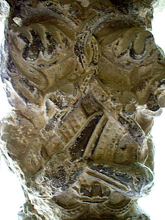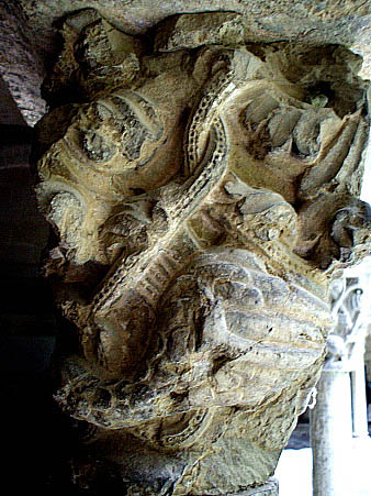Capitell nº 7Capitell amb decoració d'una parella d'ocells entre elements vegetals, formats per fulles i tiges encintades que es sobreposen i cargolen donant continuïtat a les cares del capitell. El disseny i la talla de les plomes del cos i de les ales de les aus correspon al model emprat, també, en la decoració del capitell nº 1 d'aquesta mateixa filera i, com en aquell cas, amb els animals sense referenciació simètrica. El notable desgast que presenten les dues cares externes del capitell no impedeixen seguir perfectament el traçat de les formes dels elements decoratius. ![]() |