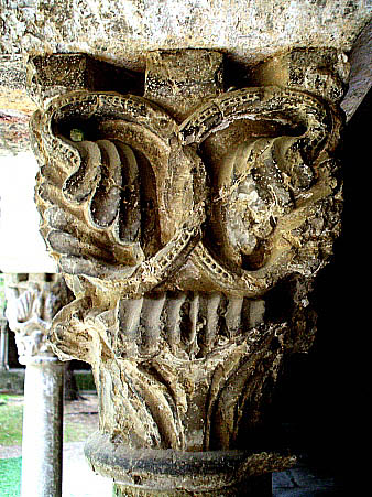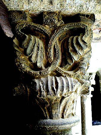 Capitell nº 8Capitell de tipus corinti amb decoració d'elements vegetals, constituïts per fulles i tiges encintades que s'encreuen i sobreposen, seguint la uniformitat del disseny de les cares. De traç i elaboració similar a d'altres capitells de la filera exterior del claustre, especialment de la cara septentrional. La decoració és idèntica a les quatre cares. ![]() |