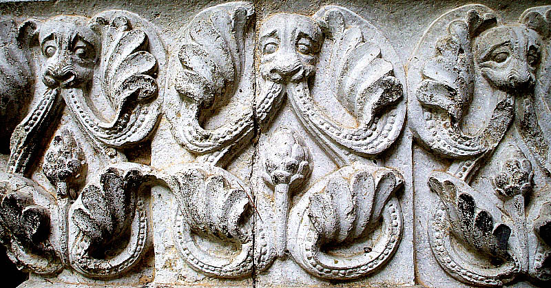 ![]() Fragment de la decoració del tercer fris. ![]() Fragment de la decoració del quart fris (1ª part). A la dreta, capitell cantoner. ![]() Fragment de la decoració del quart fris (2ª part). A l'esquerra, capitell cantoner. Bibliografia:
