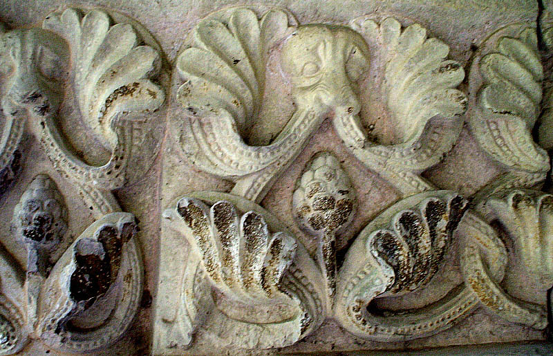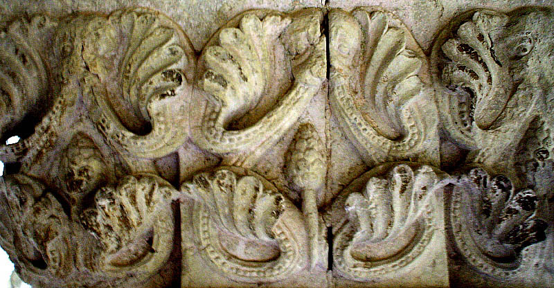 ![]() Pilar nº 11 (P11) Pilar occidental. Compost de quatre frisos i quatre capitells, tots decorats amb la mateixa temàtica i disseny d'elements vegetals que sorgeixen de la boca d'un cap d'animal fantàstic. ![]() Fragment del segon fris. El disseny compost per un cap d'animal i els elements vegetals que en sorgeixen -fulles, tiges encintades, fruit-, formen un grup circular que es va repetint a tot el pilar. |