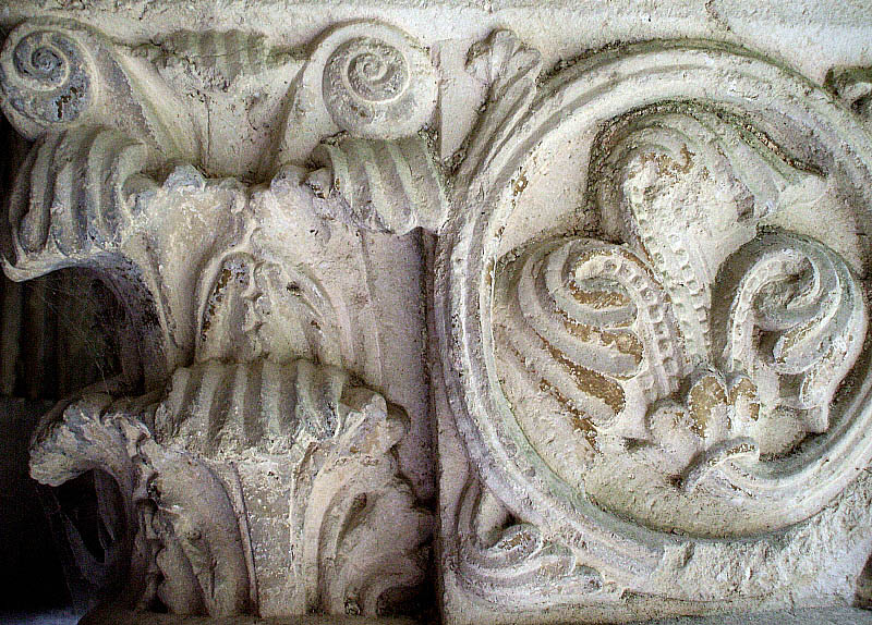 ![]() Pilar nº 5 (P5). Pilar oriental. Conjunt de frisos amb elements vegetals, amb tres capitells de tipus corintis i decoració amb elements vegetals, i capitell amb parella d'ocells sobre palmeta mossegant-se les potes.