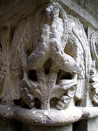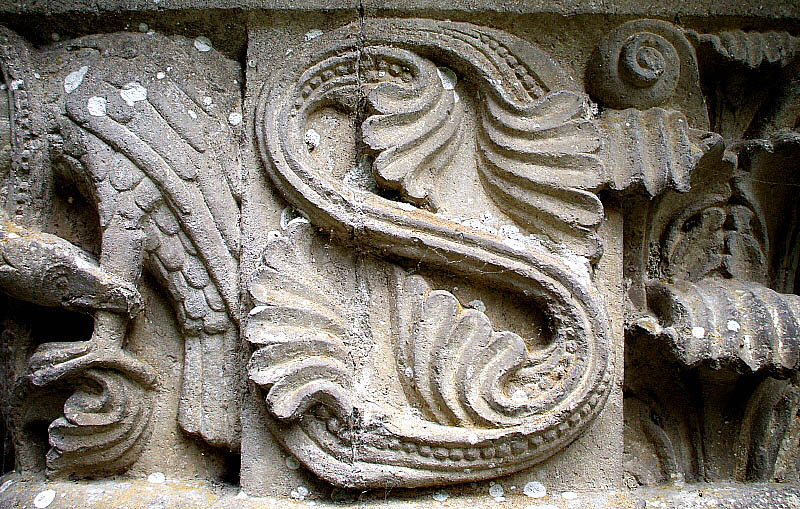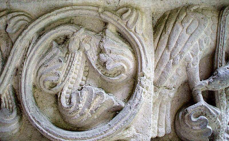 Detall del capitell amb ocell mossegant-se les potes, i part del fris amb elements vegetals.