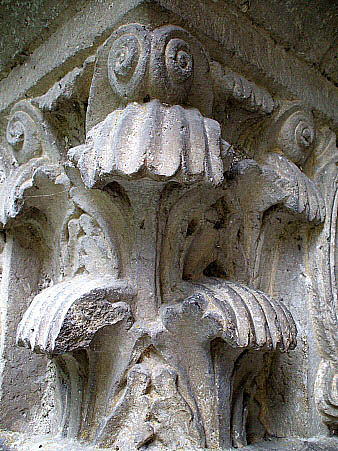 Pilar nº 5Esquerra: Capitell amb decoració d'ocells mossegant-se les potes. Aquesta activitat simbolitza l'intenció d'aixecar el vol i deixar la terra, l'ansia d'espiritualitat, com es pot veure també en els capitells del monestir de Leyre, a Navarra. Dreta: capitell de tipus corinti compost de forma simètrica per fulles i volutes senzilles a la part superior.