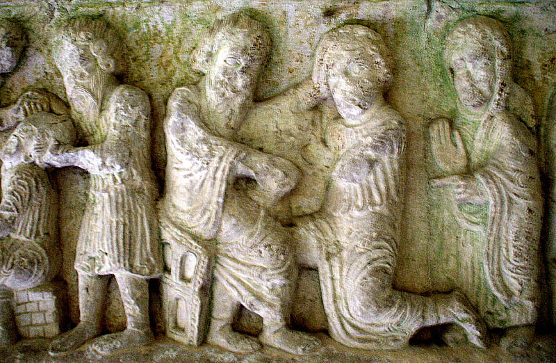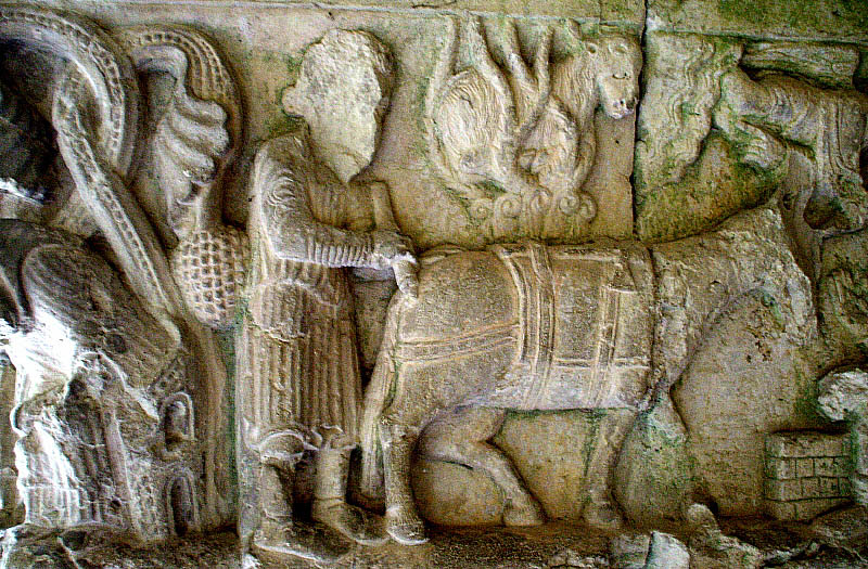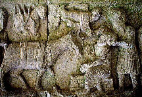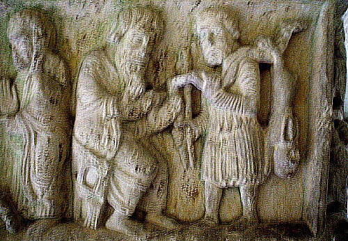 ![]() Pilar nº 7 (P7), Segon fris Pilar sud-oriental. En aquest pilar s'hi representen diverses escenes de la història d'Isaac i Jacob, en diversos frisos i capitells, alternats aquests darrers amb d'altres de temàtica vegetal i decoració zoomòrfica d'ocells picotejant fruits. ![]() Segon fris, primera escena. El viatge d'Isaac: Després d'aquests fets, Déu posà a prova Abraham i li digué: «Abraham, Abraham!» Ell respongué: «Aquí em teniu». Digué: «Pren el teu fill únic que estimes, Isaac, vés al país de Morià i sacrifica'l allà en holocaust dalt d'una muntanya que t'indicaré». Abraham es llevà de bon matí, va ensellar l'ase i prengué amb ell dos dels seus mossos i el seu fill Isaac. Va estellar la llenya de l'holocaust i es posà en camí cap a l'indret que Déu li havia dit. (Gènesi, 22:1-3) |