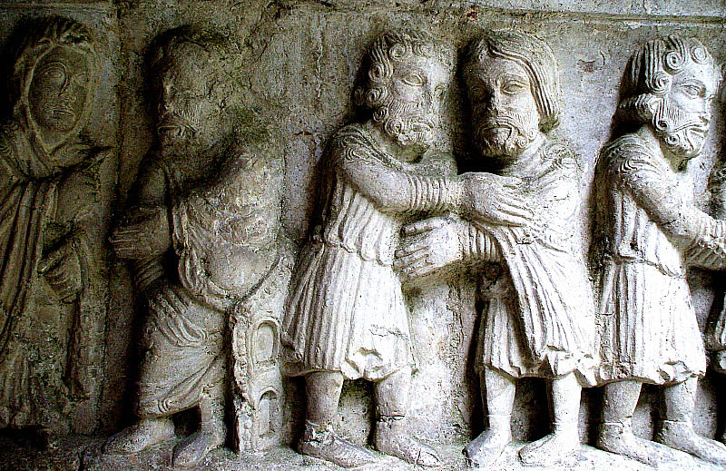 ![]() Pilar nº 7 (P7), Quart fris Pilar sud-oriental. En aquest pilar s'hi representen diverses escenes de la història d'Isaac i Jacob, en diversos frisos i capitells, alternats aquests darrers amb d'altres de temàtica vegetal i decoració zoomòrfica d'ocells picotejant fruits. ![]() Quart fris, primera escena. Anunci de Raquel a Laban de l'arribada de Jacob: Després Jacob va besar Raquel i esclatà en sanglots. Féu saber a Raquel que era parent del seu pare i fill de Rebeca, i ella va córrer a anunciar-ho al seu pare. (Gènesi, 29:11-12) |