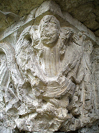 A la dreta, a baix: Capitell a la cantonada del fris, amb decoració de personatges sotmentent una parella de dracs molt estilitzats.Bibliografia: