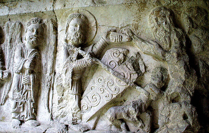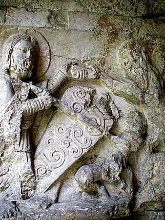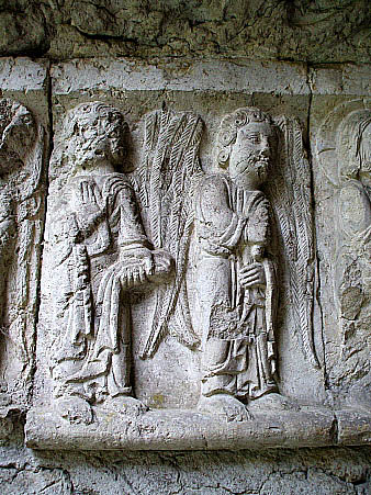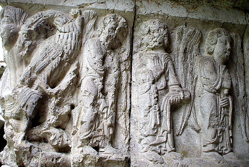 ![]() Pilar nº 8 (P8), Primer fris Pilar meridional. En aquest pilar s'hi representen diverses escenes del descens als Inferns de Jesús, els condemnats, elements vegetals i capitell amb personatges sotmetent una parella de dracs. ![]() Primer fris (1ª part). "Descensus ad inferos". Jesús descen als inferns. A l'esquerra, capitells amb personatges sotmetent una parella de dracs: Ara be, això de pujar, ¿què vol dir sinó que també havia baixat a les regions inferiors de la terra? Aquell qui baixà és el mateix que també puja més amunt que tots els cels per omplir-ho tot. (Epístola als efesis, 4:9-10) |