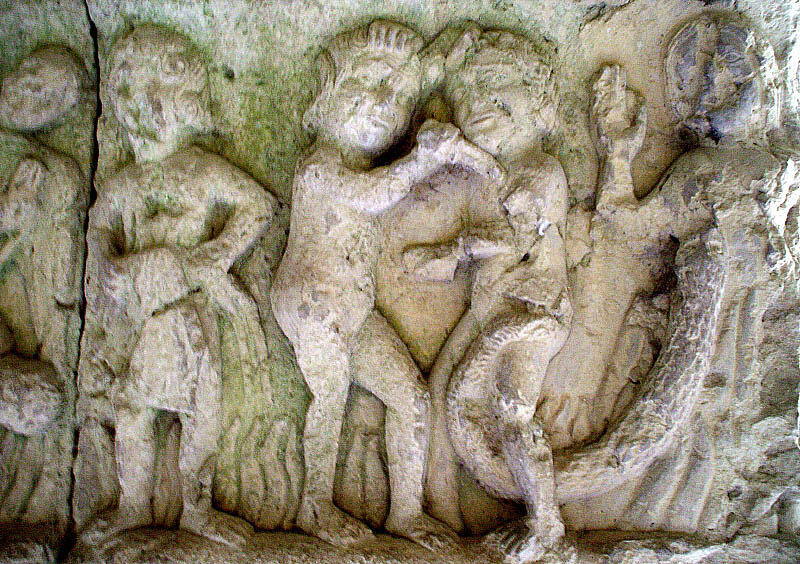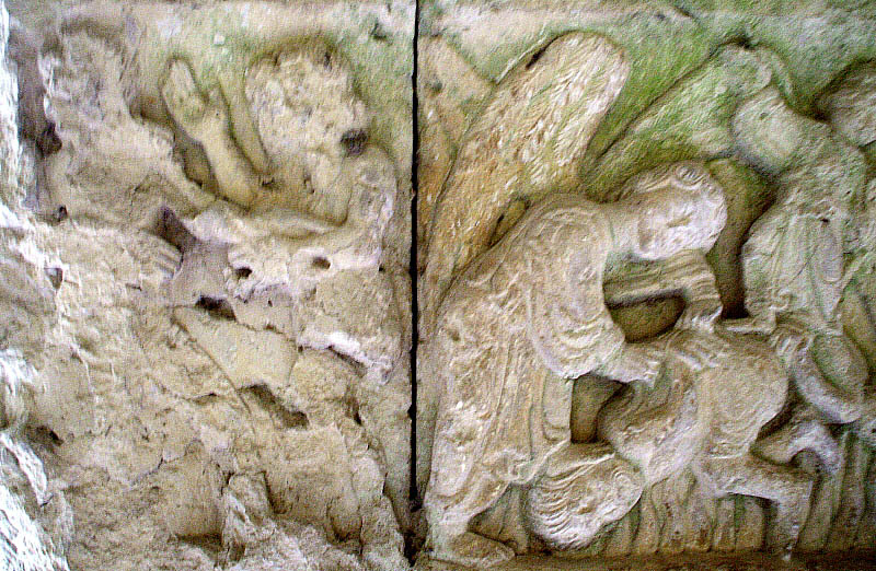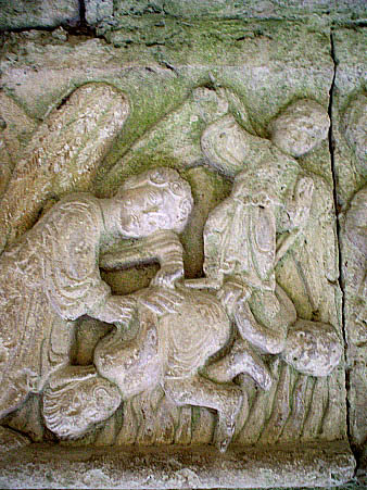![]() Pilar nº 8 (P8), Segon fris Pilar meridional. En aquest pilar s'hi representen diverses escenes del descens als Inferns de Jesús, els condemnats, elements vegetals i capitell amb personatges sotmetent una parella de dracs. ![]() Segon fris (1ª part). Dos àngels condemnen dos personatges. |