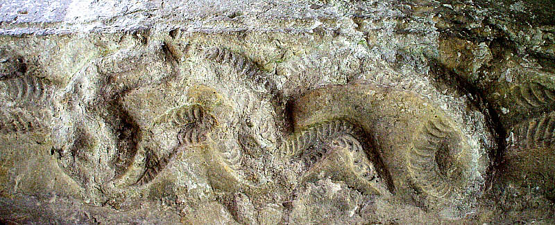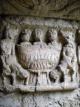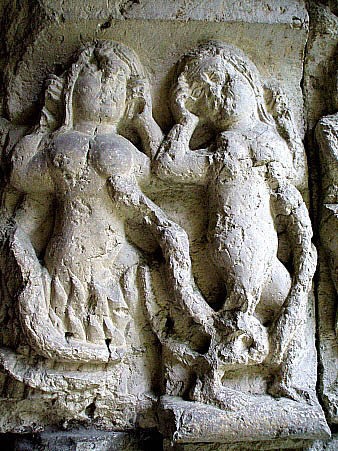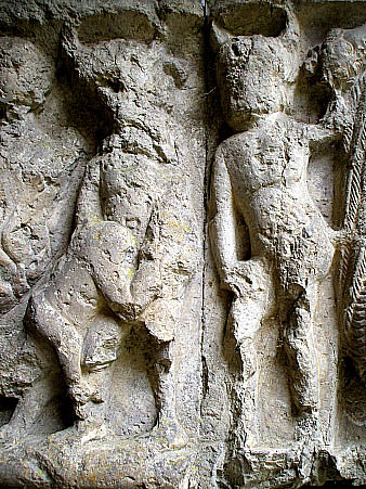A la dreta, fragment del fris de l'Infern, amb detall del cap d'un diable, i capitell amb condemnat, amb el cap inclinat cap al sòl a la part superior, i ales d'una parella d'ocells. Bibliografia: