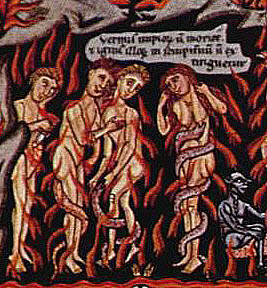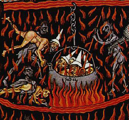 A la dreta, Detall del fris de l'Infern, amb els condemnats dins una perola. ![]() Detall del manuscrit Hortus deliciarum, d'Herrad de Landsberg, c. 1180. (Wikipèdia). Al calderó, un cartell indica Judex. |