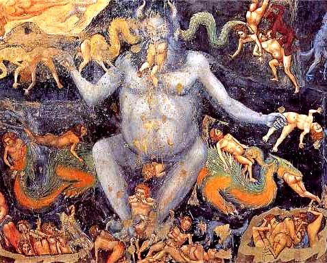 A la dreta, detall del fris de l'Infern. ![]() Detall de diable, per Giotto. Cappella degli Scrovegni, Padova. (Wikipèdia) |