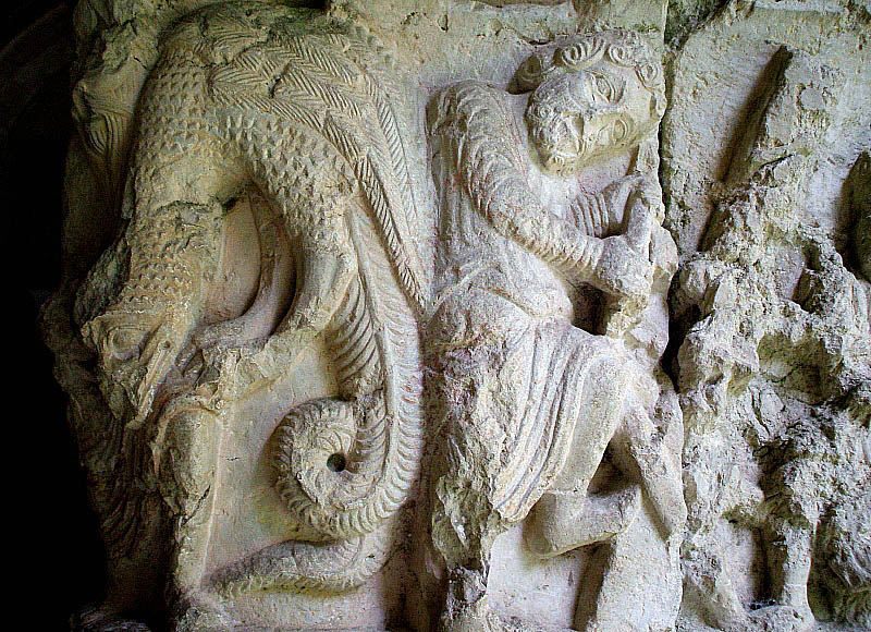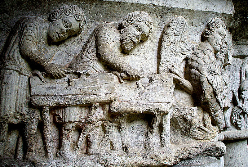 Pilar nº 9 (Capitell a l'extrem, tercer fris)Detall de les figures de l'anterior imatge parella de sirenes, temàtica emparentada amb un altre capitell gironí, del claustre de Sant Pere de Galligants, l'identificat com capitell nº 39, i en un creuer de la mateixa església, tot i que seguint una imagineria ben diferenciada en un i altre cas. Bibliografia: