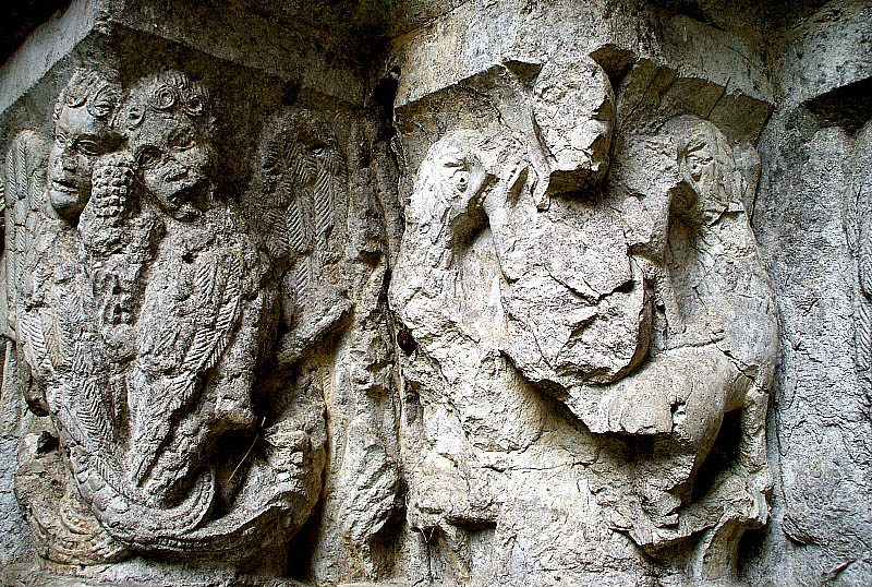 Esquerra: capitell final del fris anterior. Dreta: capitell inicial del fris, amb una escena de lluita d'un personatge que repenja els peus als lloms de sengles lleons que el flanquegen i li mosseguen les mans.