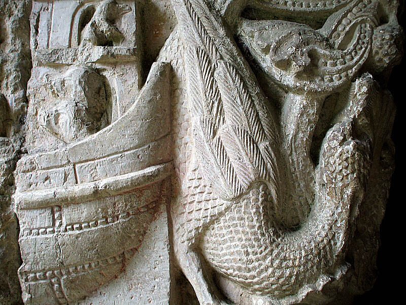Capitell final del fris amb representació d'una parella de dracs entre elements vegetals, picotejant fruits. Bibliografia:
