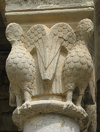 El nº 28 (dreta) amb temàtica zoològica amb quatre falcons caçadors, un a cada angle, tocant-se les ales mig esteses que omplen les cares centrals del capitell. Les urpes dels animals agafen l'astràgal. Aquesta mateixa temàtica i esquematització es troba al capitell nº 28 del claustre de Sant Pere de Galligants.