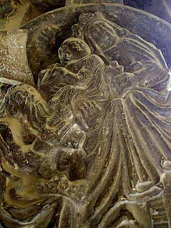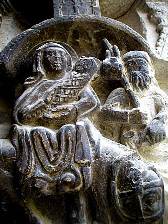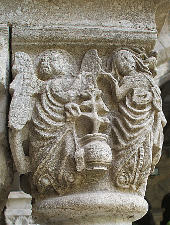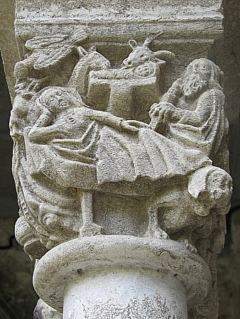 A l'escena, Maria, asseguda damunt la burra, porta en braços, embolcallat, l'infant Jesús, mentre que Josep, amb una vara de la que porta penjats els estris, condueix l'animal. En algunes representacions romàniques i gòtiques de l'escena, s'hi afegeix un àngel que guia el grup. Aquest és un dels escassos capitells del claustre amb representacions antropomòrfiques. |