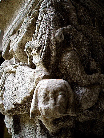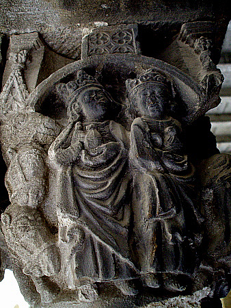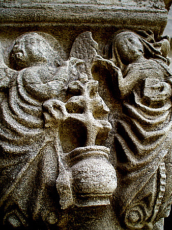 Entre els dos personatges apareix un element vegetal, possiblement florit. A la part superior dreta de Maria, i formant part també de la següent cara del capitell, apareix una au que toca lleument amb el bec la galta de Maria, probablement una representació, segons la simbologia tradicional, de l'esperit sant. Al claustre de Sant Pere de Galligants s'hi pot veure un capitell amb la mateixa temàtica, romànic, i una composició semblant.